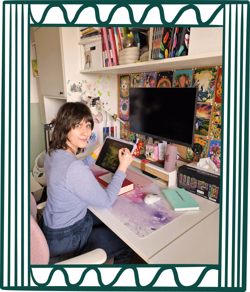 Ilustracja to moja główna ścieżka twórcza i zawodowa — przestrzeń, w której czuję się najbardziej sobą. Tworzę cyfrowo, łącząc pracę w Procreate i Photoshopie, ale dużą wagę przykładam do tego, by moje prace zachowały charakter naturalnej, odręcznej kreski.