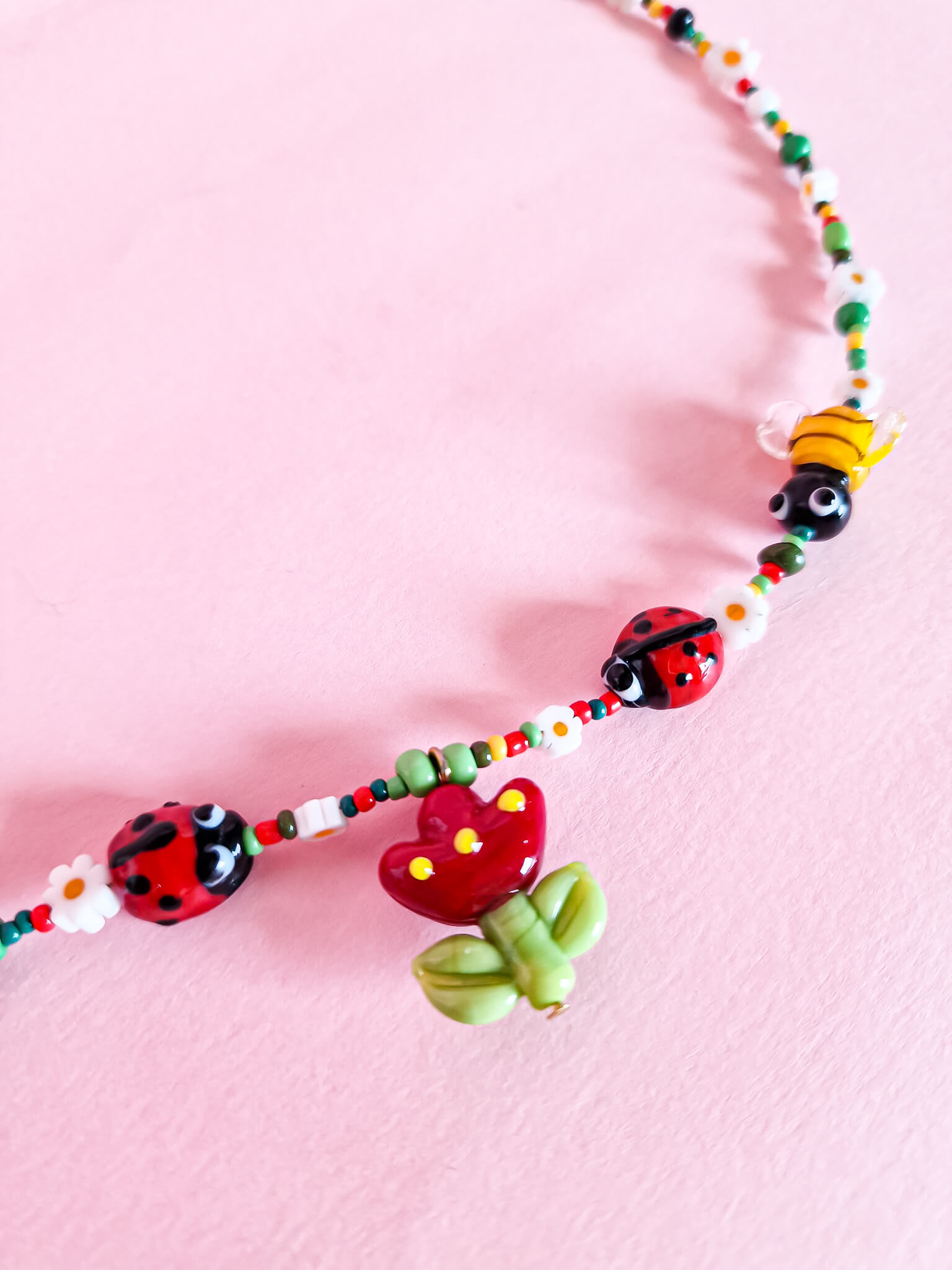 Piękny naszyjnik z uroczymi szklanymi owadami i kwiatkiem. Całość nawiązuje do natury i oddaje ją poprzez kolory.